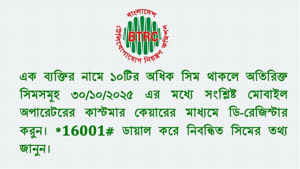এক ব্যক্তির নামে ১৫টির অধিক সিম থাকলে অতিরিক্ত সিমসমূহ ৩০/১০/২০২৫ এর মধ্যে সংশ্লিষ্ট মোবাইল অপারেটরের কাস্টমার কেয়ারের মাধ্যমে ডি-রেজিস্টার করুন। *16001# ডায়াল করে নিবন্ধিত সিমের তথ্য জানুন।